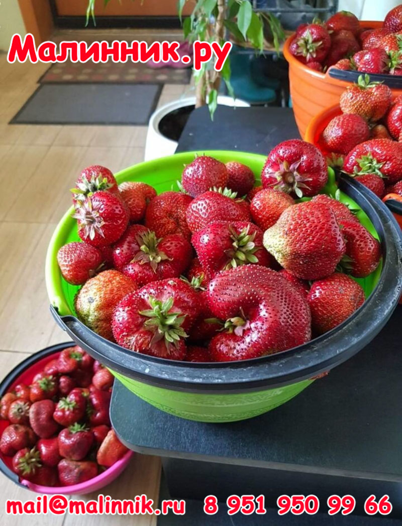 Мощные, густые, многорожковые кусты с большими тёмно-зелёными листьями и толстыми (почти в карандаш!) цветоносами отличаются солидными размерами, особенно в ширину. Посадка желательна разреженная. Ягоды-гиганты крупные и очень крупные — размером со среднее яблоко(!), первого сбора — часто широким гребешком, следующие — округло-конические, красно-малиновые, достаточно плотные, что совершенно не портит великолепный вкус удивительно красивых ягод. Мякоть необыкновенно сочная, богатого истинно-земляничного вкуса со множеством оттенков и великолепным ароматом лесной земляники. Собирать такие «яблочки»- не просто удовольствие — восторг, аж дух захватывает! Урожайность тоже впечатляет: за сезон более 2кг с куста аппетитных увесистых ягод — более чем достойно! Ягоды устойчивы к гнилям — на грядке не портятся, терпеливо ждут, когда их соберут.