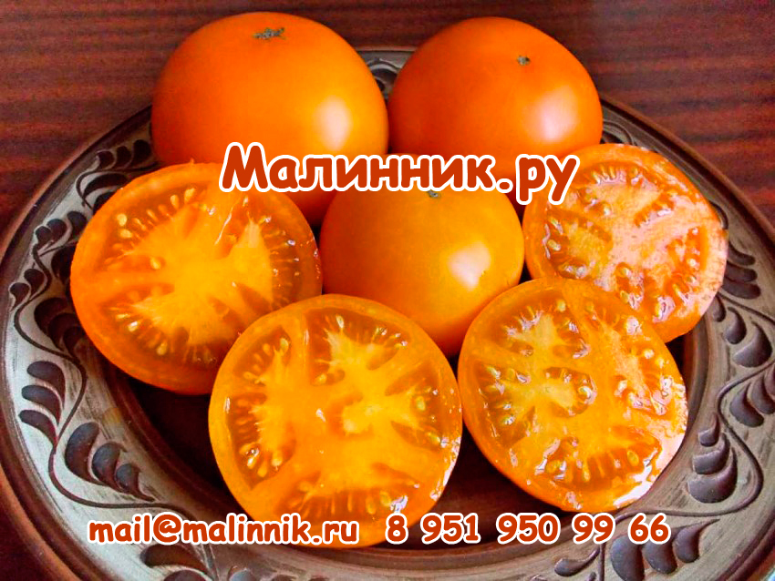 ВКУС ТОМАТОВ: сладкий с нежно-фруктовой кислинкой и высоким содержанием бета-каротина. Мякоть сочная и мясистая, такого же апельсиново-оранжевого цвета, что и плотная кожица. Аромат томатный. Семян мало.