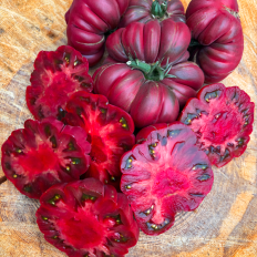 Биф-томат: сплошная малиновая, сочная, восхитительно-нежная сливочно-томатная мякоть! Вкусный, просто *Ах*! Очень любим такие томаты, их можно охарактериз. одним словом - *нажористые*! Завязываемость хорошая. Плоды лаковые, мясистые, громоздкие снизу доверху. Среднеспел, индет, 300-500-1000гр - средн. разм. каждого томата, отдельные до 1800гр, для теплицы. СЛАДКИЙ!!!, мякоть мясистая, сочная, малосем.; для употр. в свежем виде, приготовл. домашн. блюд, консерв., а также для сока, заправок, кетчупов и аджик